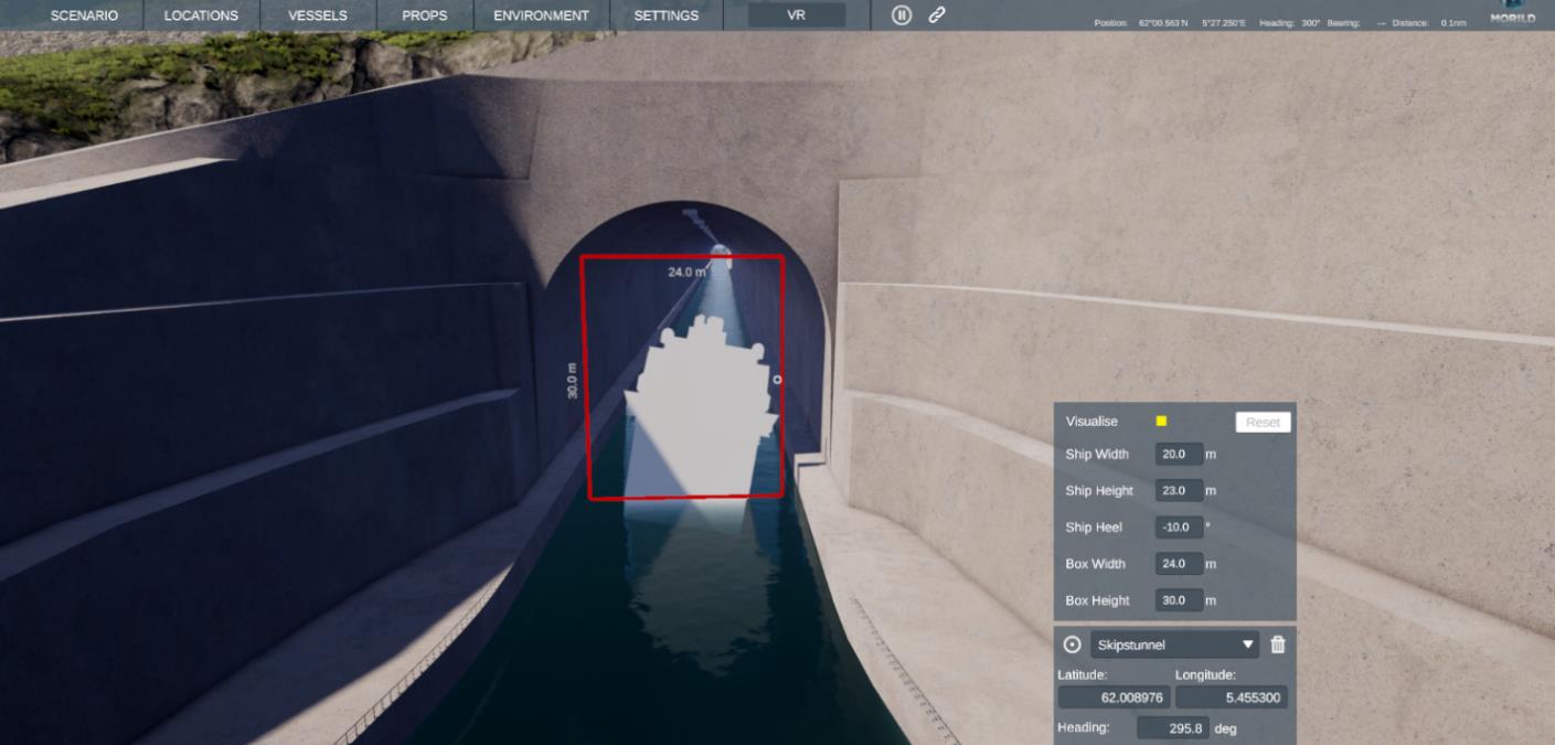 DNV led the workshop held in Ålesund, attended by representatives and navigators from the Norwegian Maritime Authority (Sjøfartsdirektoratet), Havila, Hurtigruten, Rostein, NTNU and the NCA’s pilot service. To enhance understanding of the discussed scenario and visualize it for the participants, the tunnel was modelled in a VR scenario where the navigation corridor was shown, and a vessel could sail through the tunnel. The focus of the workshop was to identify hazards, discuss safety barriers, and document other possible recommendations, particularly related to human factors.