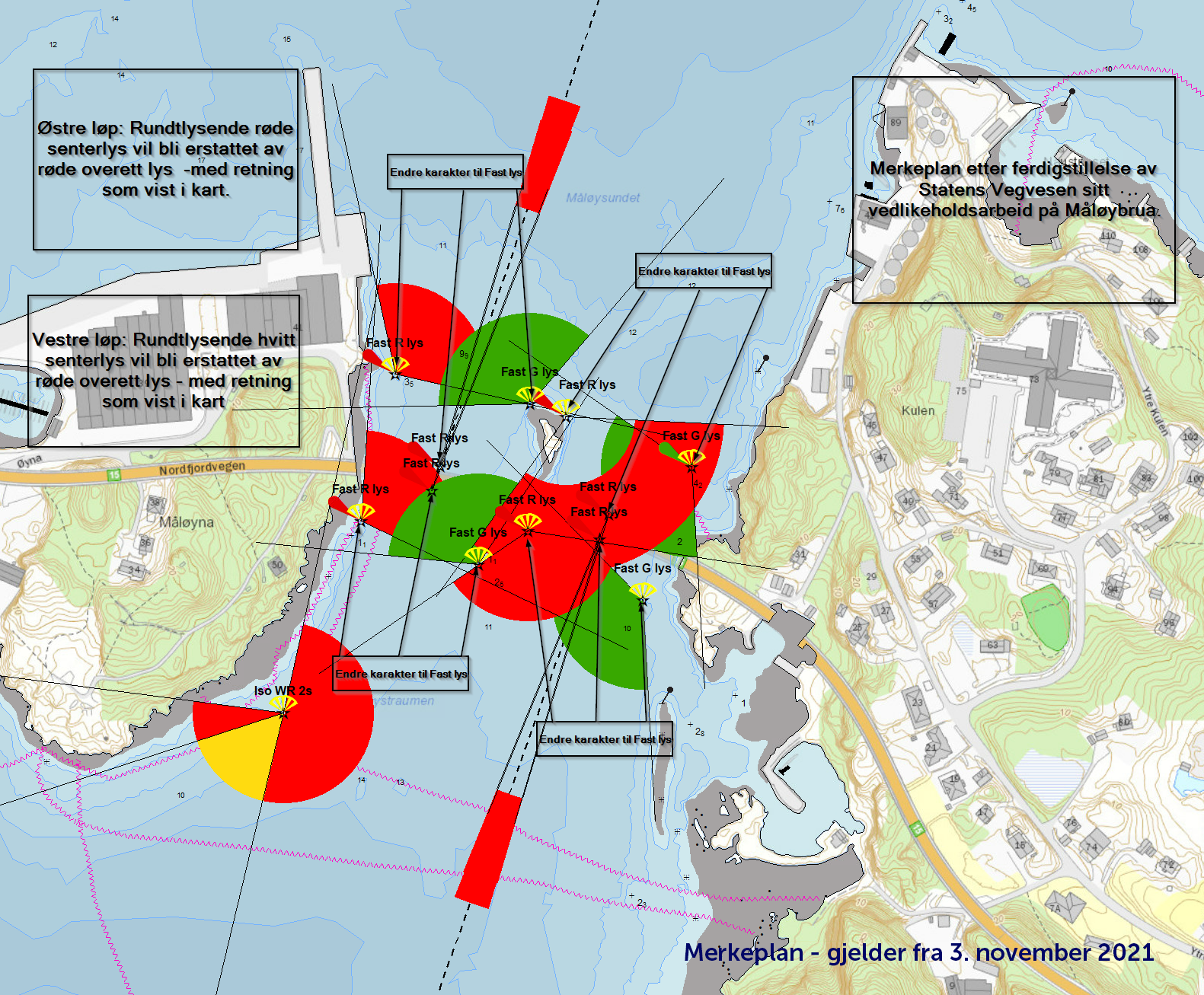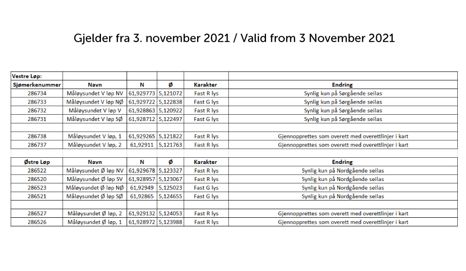 - Se oversikt av berørte navigasjonsmerker som gjelder fra 3. november 2021