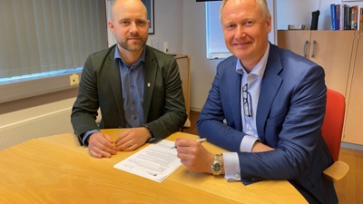 Jostein Moe (t.v.), leder for Kystverkets utbyggingsavdeling, og rådmann Robert Pettersen i Rana kommune har signert samarbeidsavtalen for Innseiling Mo i Rana-prosjektet.