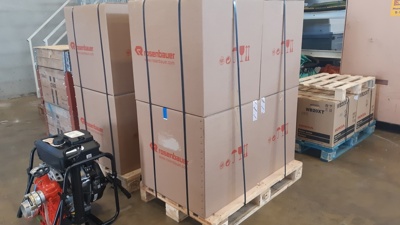 Bildet viser åtte Otterpumper, fire Hondapumper samt ulike pumpeslanger som er klargjort for levering. DSB (Direktoratet for samfunnssikkerhet og beredskap) har samarbeidet tett med Kystverket i forbindelse med denne forespørselen, og de vil sørge for transporten fra Horten til destinasjonen i Ukraina.