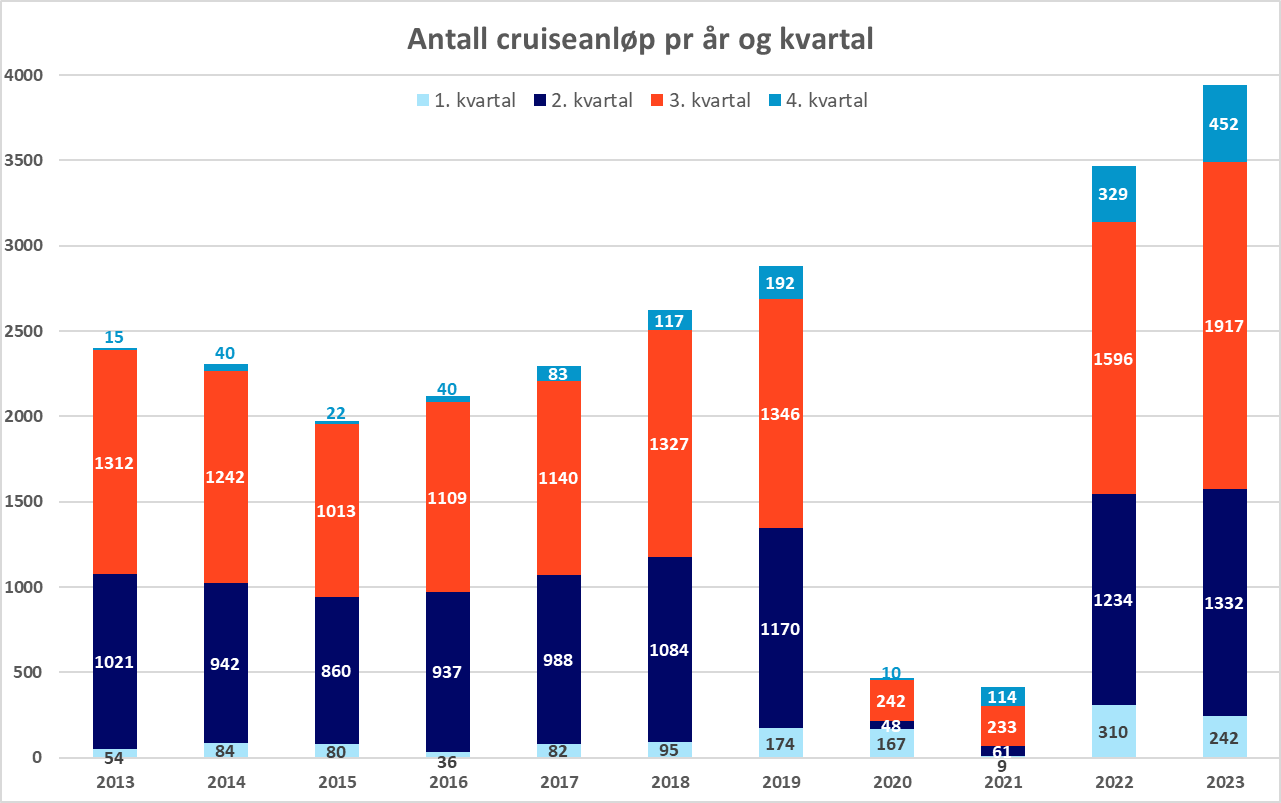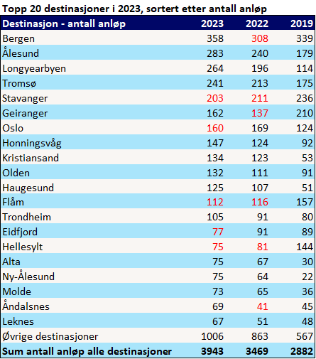 Tallene viser totalt 3943 cruiseanløp og over 6,1 millioner passasjerer i 2023. Passasjerer som anløper flere havner blir telt på nytt for hver havn de anløper. Med andre ord er ikke dette unike passasjerer, da de blir telt flere ganger i løpet av et Norgesbesøk.