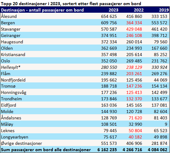 Med over 650 000 cruisepassasjerer i 2023 ligger Ålesund i statistikktoppen som fjorårets mest besøkte destinasjon. Det er en økning på over 237 000 cruisepassasjerer siden 2022. Bergen var fjorårets mest besøkte destinasjon målt etter antall anløp og nest mest besøkte destinasjon etter passasjertall, med opp mot 610 000 cruisepassasjerer i 2023. For Bergen er dette en økning på 50 anløp og over 245 000 cruisepassasjerer siden 2022.