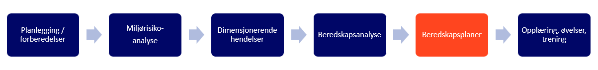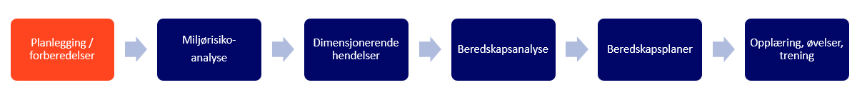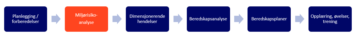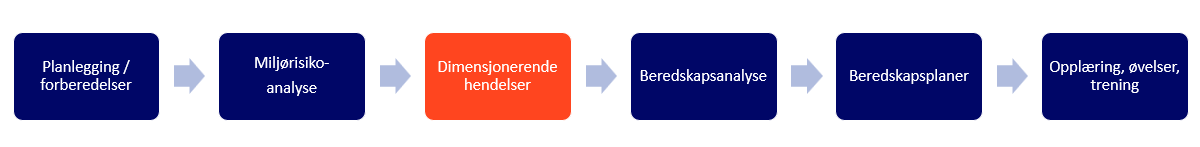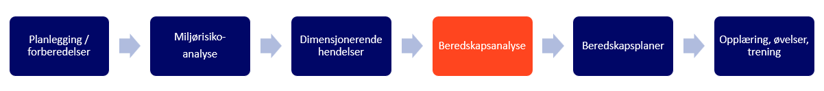 Etter at miljørisikoanalysen er gjennomført skal det velges ut representative scenarioer som skal være dimensjonerende for beredskapen. Dette er nærmere beskrevet i kapittel 4. På bakgrunn av de utvalgte scenarioene fra miljørisikoanalysen skal kommunen gjennomføre en beredskapsanalyse. Dette er nærmere beskrevet i kapittel 5.