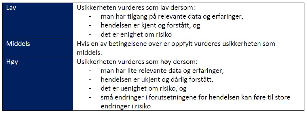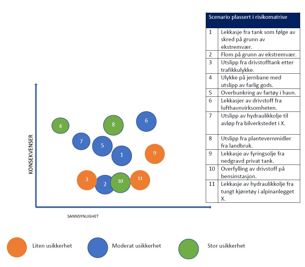 Eksempel på risikomatrise hvor de analyserte scenarioene kan plasseres ved angitt usikkerhet