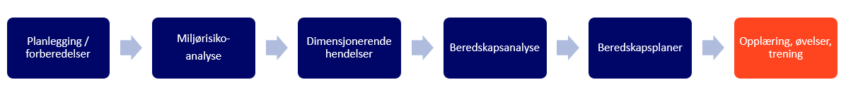 Metoden i miljørisikoanalysen er beskrevet i kapittel 3, mens metoden i beredskapsanalysen er beskrevet i kapittel 5. Metodene er tilpasset kravene i forskrift om kommunal beredskap mot akutt forurensning. Figuren nedenfor viser de ulike stegene i beredskapsarbeidet, og illustrerer også hvordan de ulike elementene er omtalt i denne veilederen henger sammen.