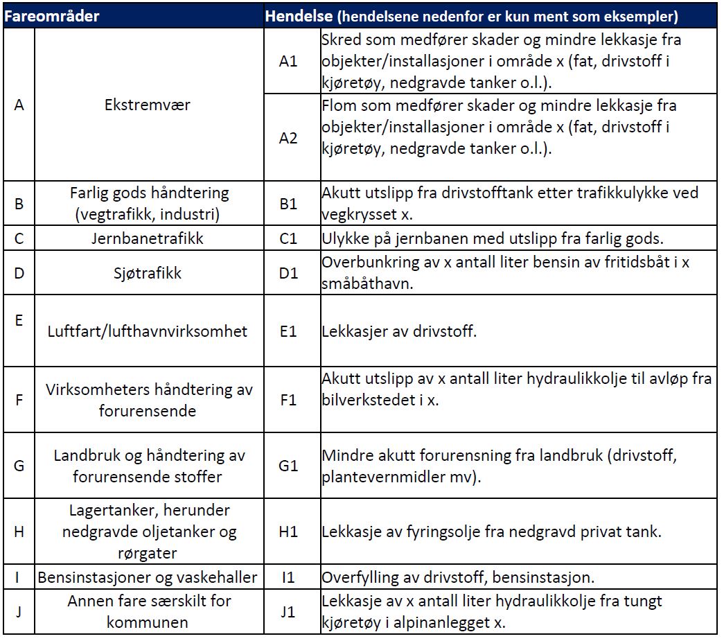 Kommunen skal kartlegge aktuelle kilder til mindre tilfeller av akutt forurensning og ha en detaljert, prioritert og kartfestet oversikt over miljøverdier og sårbare naturområder i kommunen. Kommunen skal analysere miljørisikoen forbundet med mindre tilfeller av akutt forurensning forårsaket av blant annet kjemikalier, herunder petroleumsprodukter og andre oljeprodukter, samt farlig avfall.
