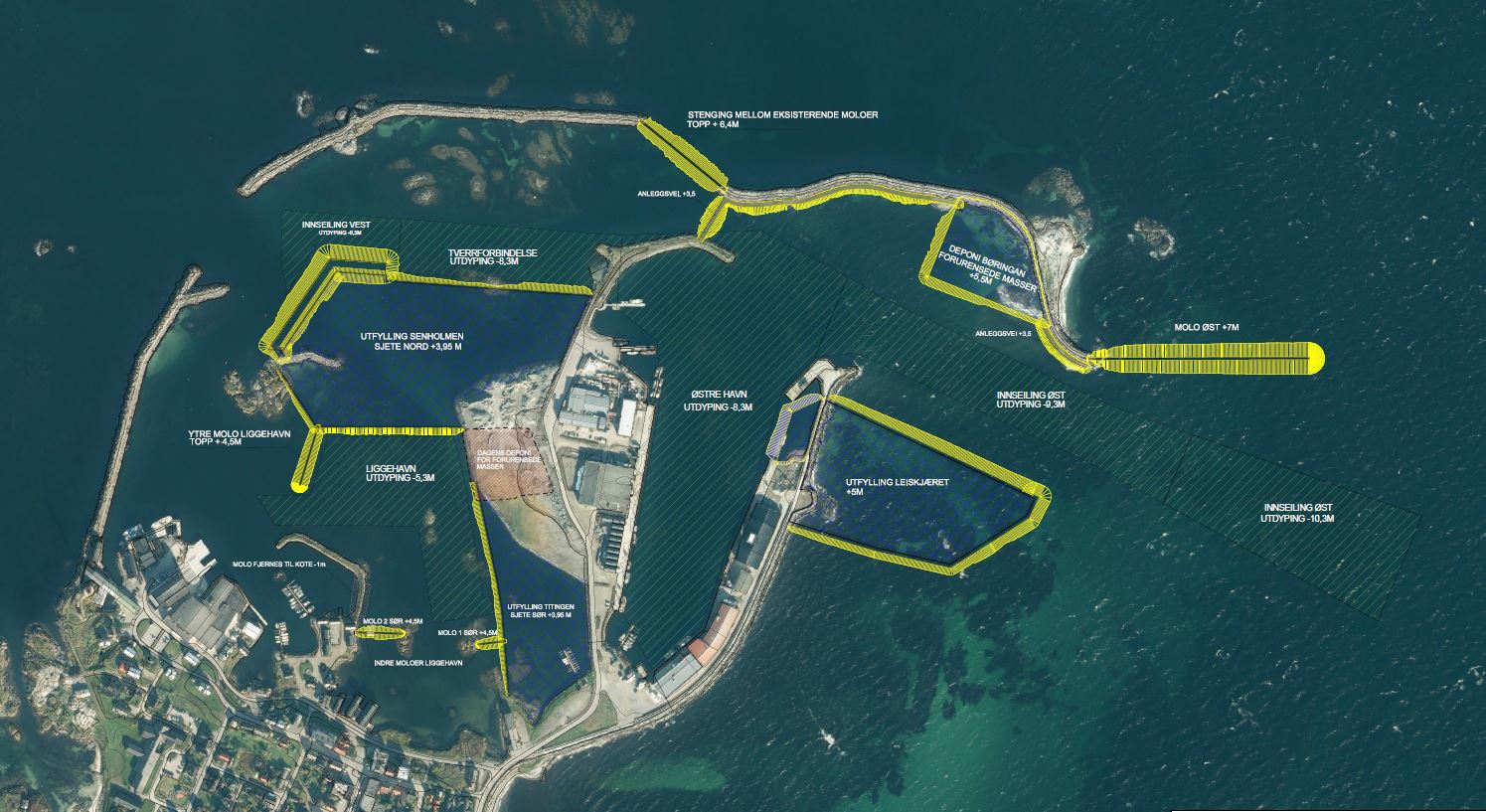 Resultatene fra omfattende numerisk analyse, grunnundersøkelser, bølge- og strømmålinger og videre har dannet grunnlag for endelig valg og utforming av tiltaket. For å begrense sandvandring og bølgepågang i innseilingen fra øst skal Børingmoloen forlenges med 250 meter. Innseilingen fra havna i nord, mellom Skarvbard- og Børingsmoloen, legges igjen samtidig som deler av Industrisjeteen fjernes. Da får man en god passasje mellom østre og vestre del av havna. I indre vestre havn, ved liggehavna, bygges tre mindre moloer og deler av eksisterende molo fjernes for å sikre roligheten i denne delen av havna.