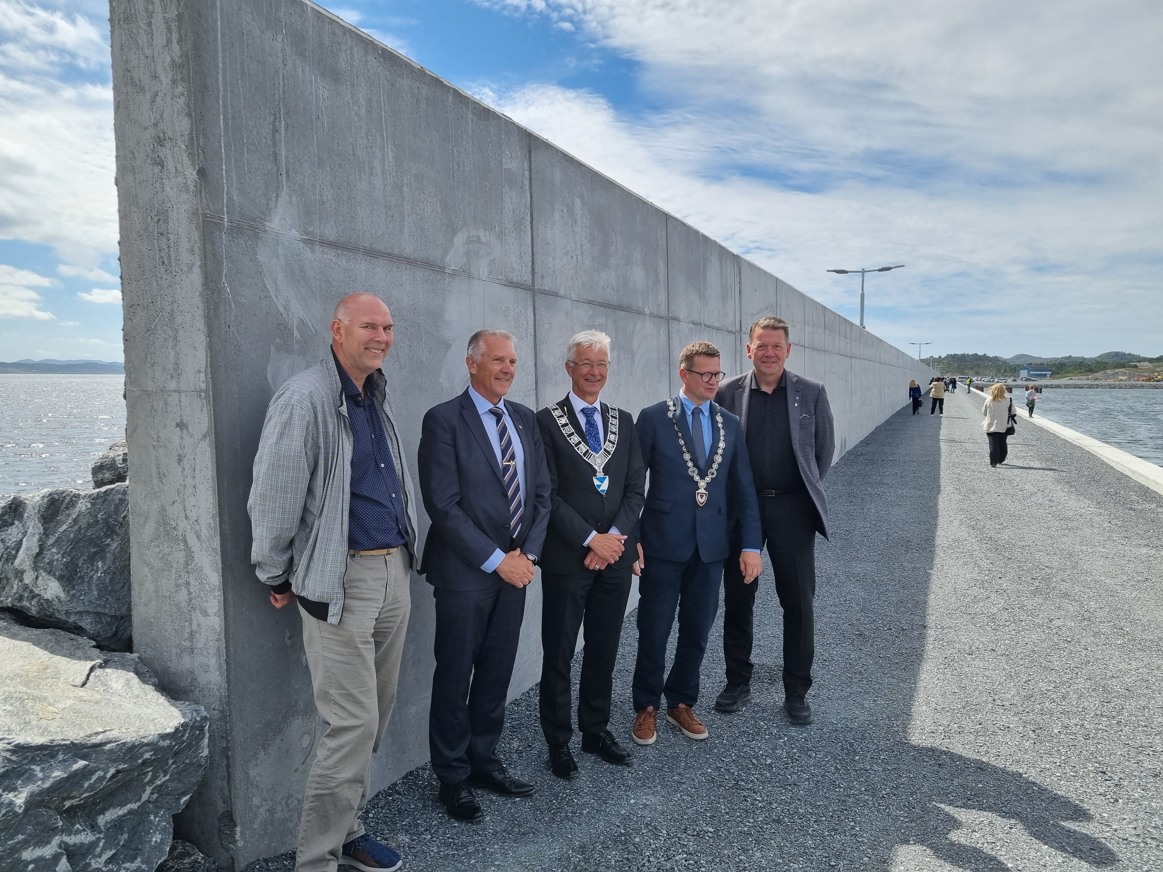 Frå venstre: Prosjektsjef Torgrim Storstein frå entreprenør Vassbakk & Stol, assisterande kystdirektør Per Jan Osdal, fylkesordførar Vestland fylkeskommune Jon Askeland, ordførar Bømlo kommune Morten Helland og prosjektleiar Terje Andreassen i Vestland fylkeskommune.